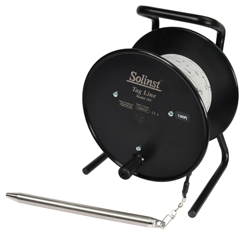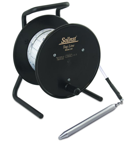 The Solinst Tag Line uses a weight attached to a laser marked cable or tape, and is principally designed for use during the installation of monitoring wells. The Tag Line also provides a simple method to measure the depth to the bottom of a well. The cable or tape is mounted on a sturdy free-standing reel with a carrying handle, weight holder and brake.