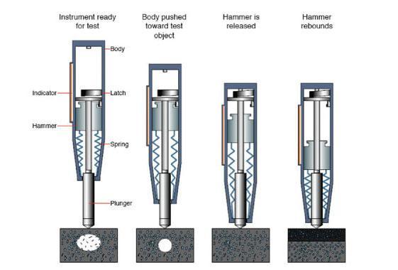 Proceq Schmidt ® concrete testers are used for the non-destructive measurement of the concrete/mortar compressive strength and the control of the uniform concrete quality (in-situ concrete and prefabricated structures) as well as for detecting weak spots. The compressive strength (fc) is established by measuring the hardness (rebound value R) of the concrete surface and with the conversion curves. ORIGINAL SCHMIDT ® Concrete test hammers with various impact energies can be used depending on the form and sizes of the concrete structures (lower impact energy for thin and/or weak components).